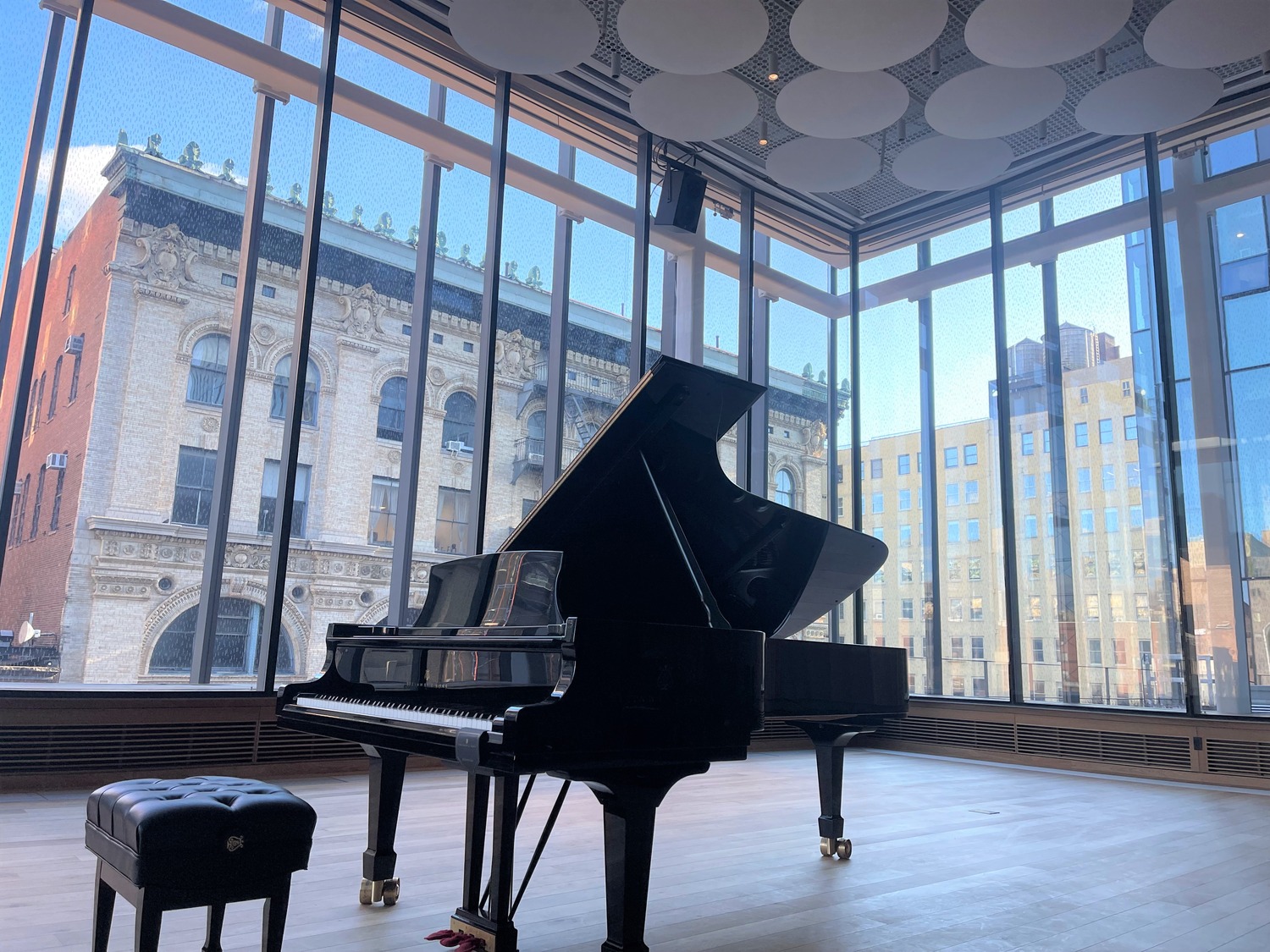 Where possible, the performing arts spaces were placed near the core of the facility to mitigate outside noise. The orchestra rehearsal room, however, overlooks the street, and while it provides an excellent backdrop of classic New York City architecture, it also poses greater sound isolation considerations. We quelled these concerns by utilizing a double-skin, faceted glass envelope to block out exterior noise as well as isolation pads placed in the foundation to minimize vibration from the underground subway line.